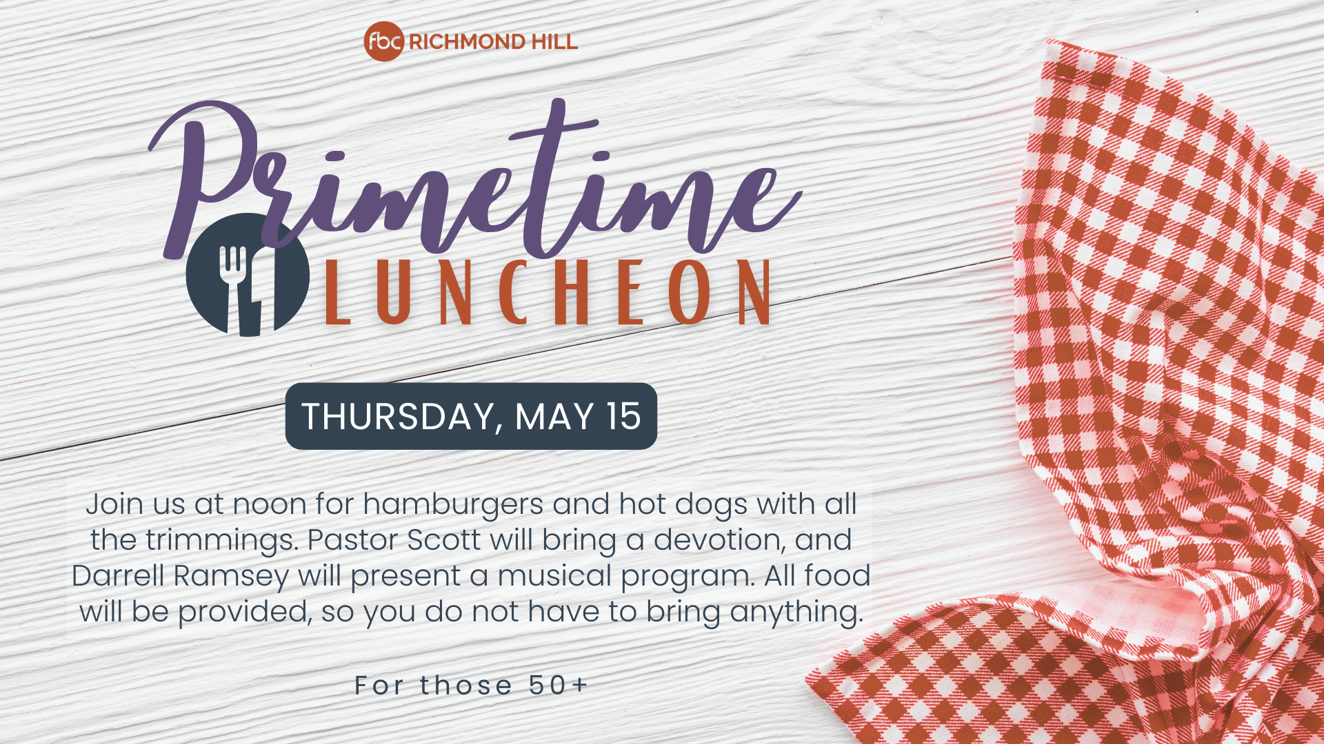 Join us on May 15th at noon for our Primetime Luncheon! We will serve hamburgers and hot dogs with all the trimmings, so you do not have to bring anything. Darrell Ramsey will provide music, and Pastor Scott will bring a devotion.