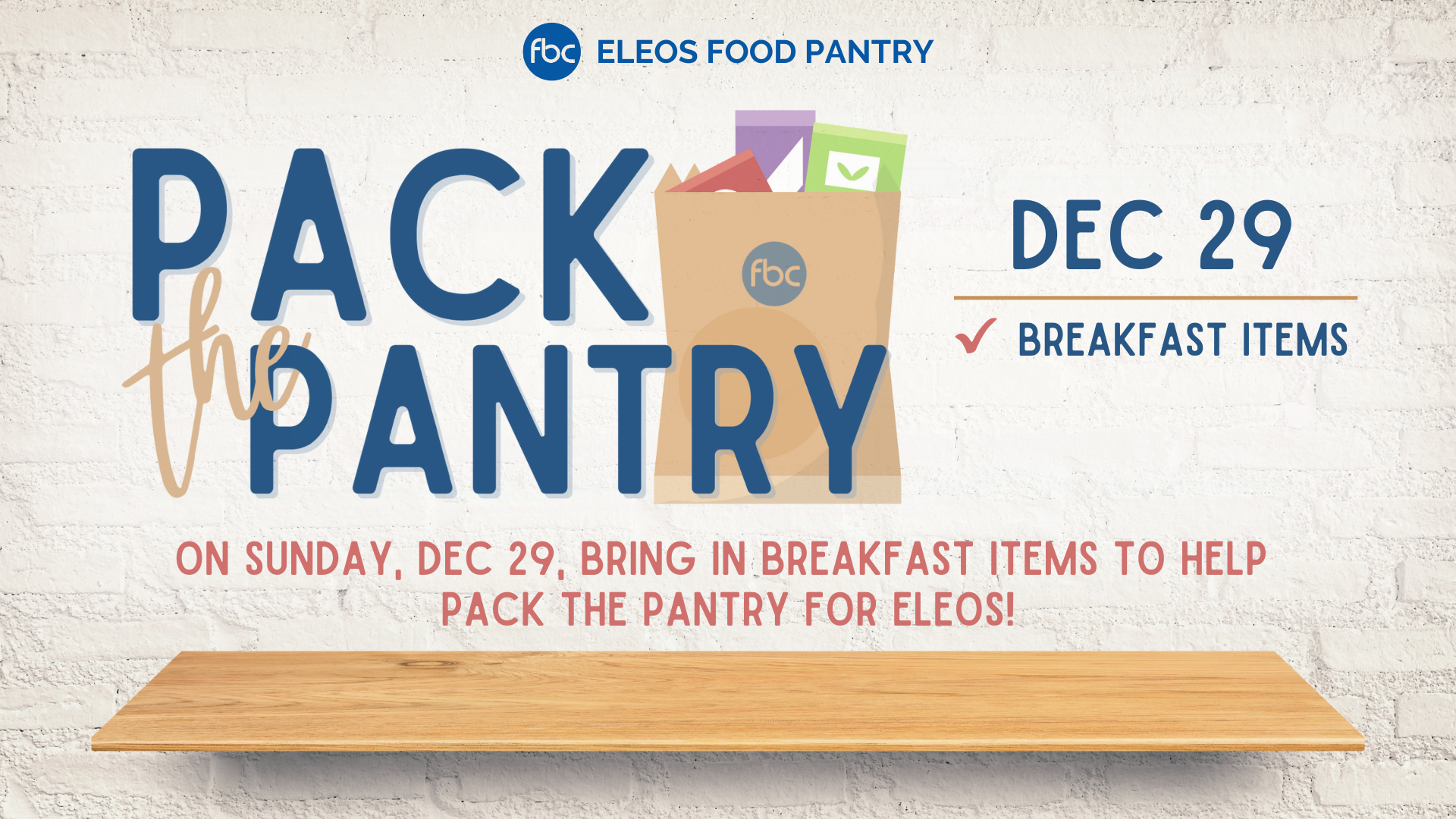 On Sunday, December 29th, don’t forget to bring in your non-perishable breakfast items to help Pack the Pantry for our ELEOS Food Pantry.