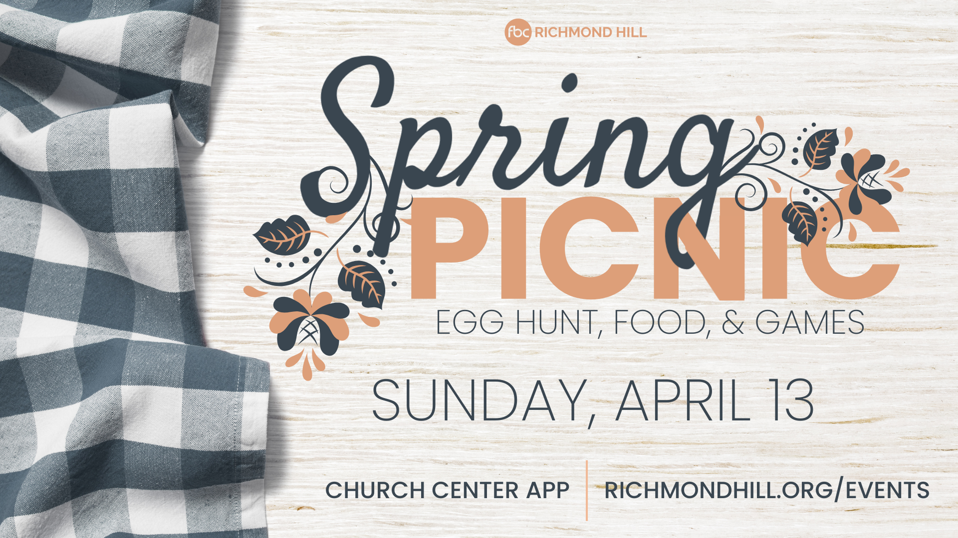 We are excited to host our 2nd Annual Spring Family Picnic on Sunday, April 13th, right after our 10:30am service! This event will be open to the entire community and church family. We’ll be having an afternoon of fun with an Egg Hunt, Food, & Games. We need help putting together this special event, though, and that’s where you can help! If you’re willing to help serve on a team for helping to set up and serve at this event, please sign up here! If you are not able to serve but would like to bring a covered side dish, please sign up here, as well, and let us know what you would like to bring! If you have any further questions, please reach out to Jeannine Johnson (jeannine@richmondhill.org).