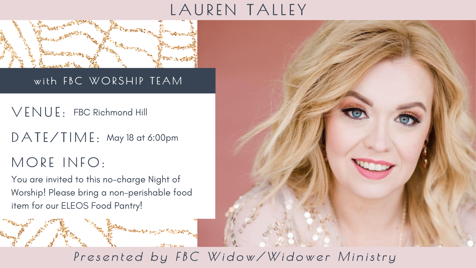 We are excited to welcome back Lauren Talley on Sunday, May 18th, at 6:00 for a joint Worship Night with our FBC Worship Team! This is a no-charge event, but please bring a non-perishable food item for our ELEOS Food Pantry!