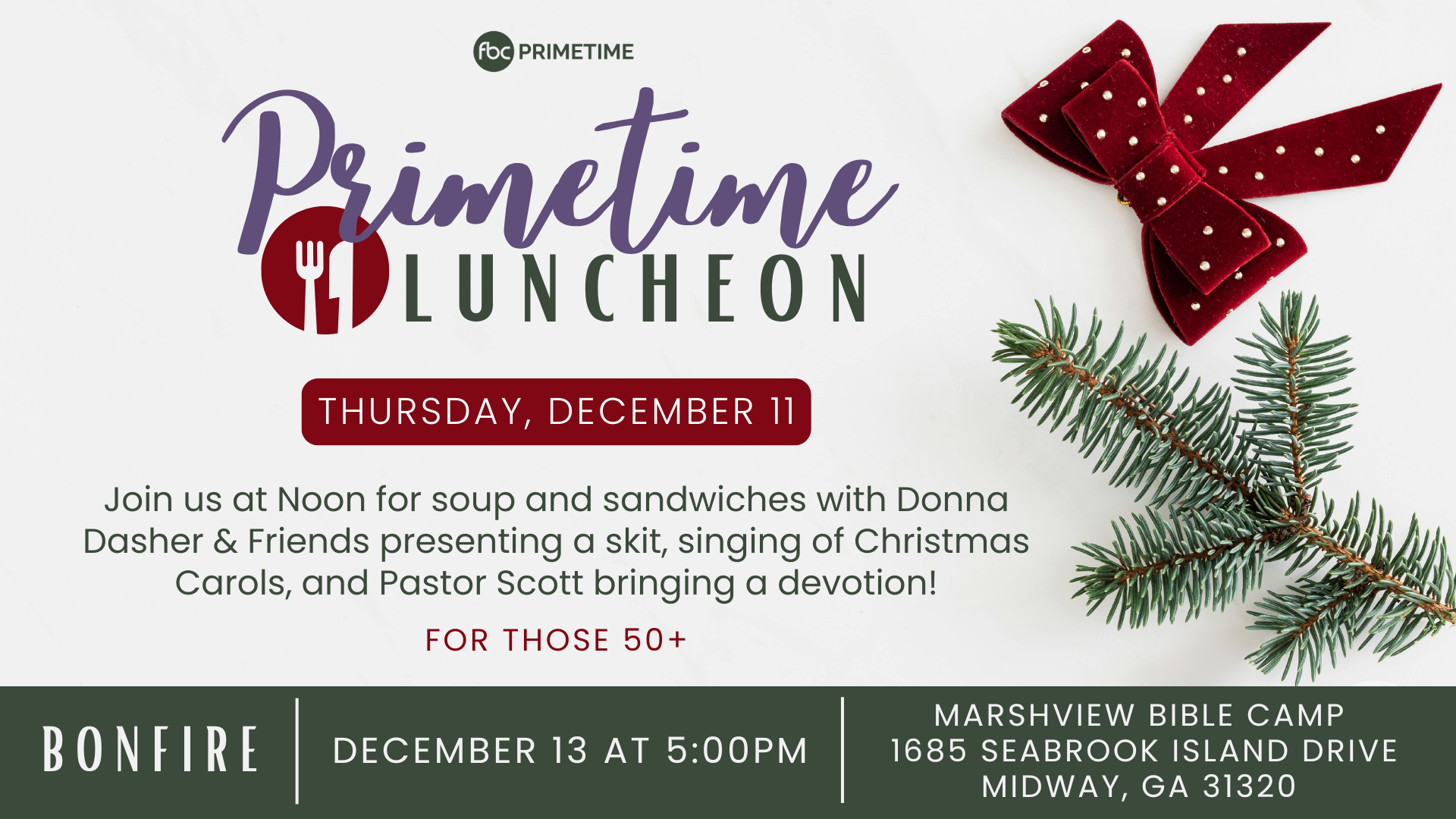 Our next Primetime Luncheon will be on Thursday, December 11th, at noon. We’ll be enjoying soup and sandwiches with Donna Dasher & Friends presenting a skit, singing of Christmas Carols, and Pastor Scott bringing a devotion. |