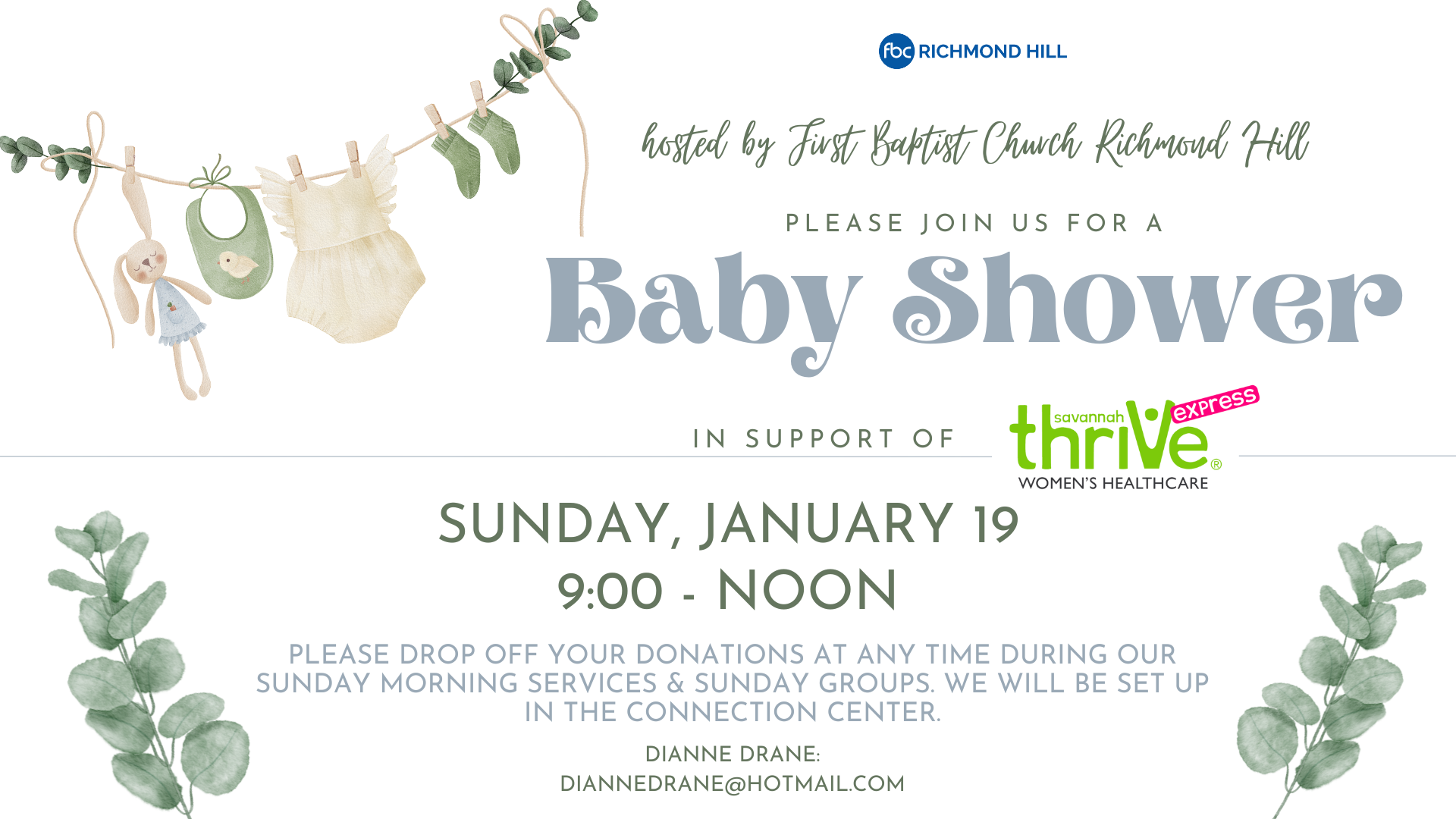 Please join us for a Baby Shower in support of Empower Sav Women’s Healthcare – formerly known as Thrive Savannah! On Sunday, January 25th, please drop off your donations at any time during our morning services & Sunday Groups in the Connection Center.